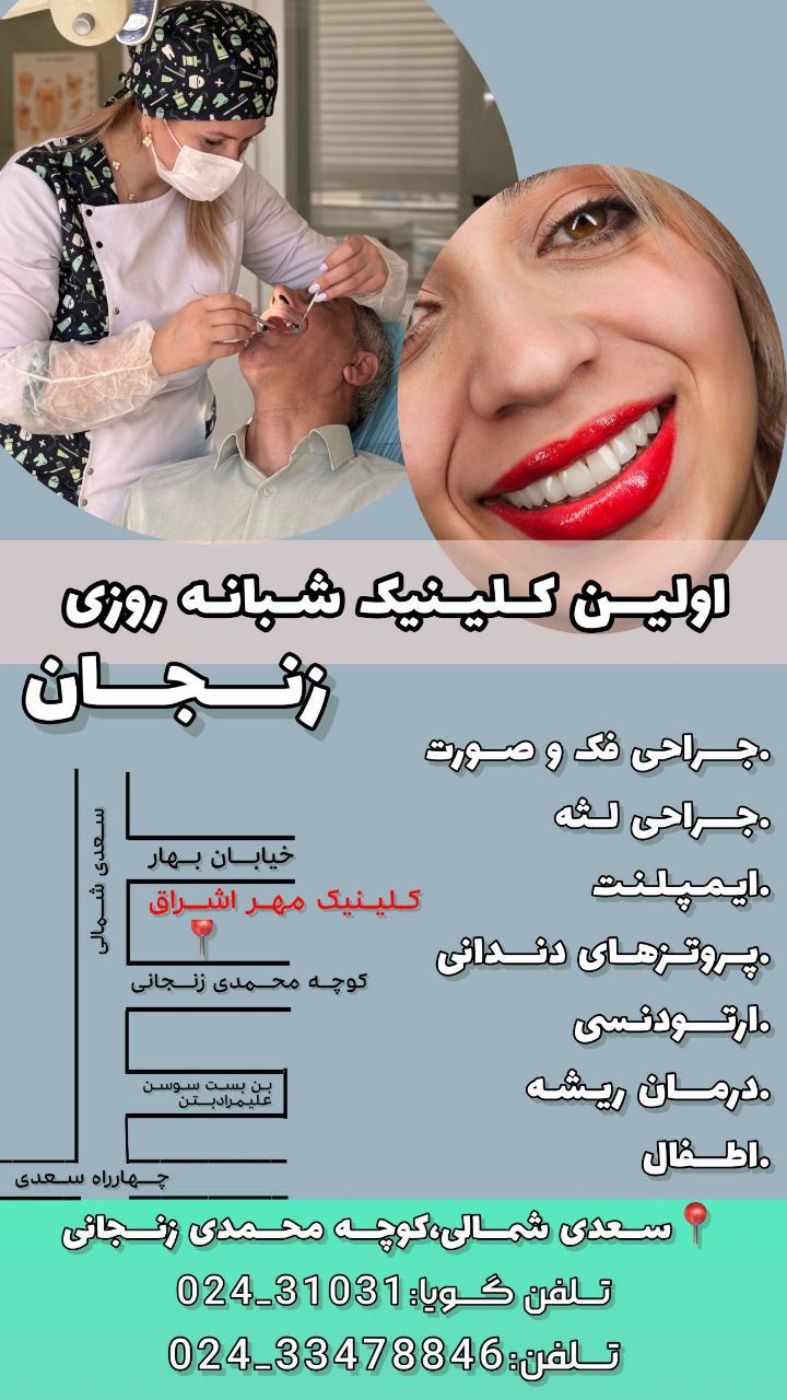 کلینیک دندانپزشکی مهر اشراق اولین کلینیک دندانپزشکی شبانه روزی زنجان بیش از دو دهه فعالیت یکی از مجهزترین و بزرگترین و کامل ترین کلینیک دندان پزشکی زنجان بوده که تمامی خدمات دندان پزشکی عمومی و تخصصی توسط دندان پزشکا متخصص و مجرب با تجهیزات مدرن و پیشرفته و مواد مصرفی کیفیت بالا و با تعرفه مصوب دولت در محیط آرام و دلنشین و استریل به تمامی سنین خدمات دندان پزشکی ارائه مینمایند .